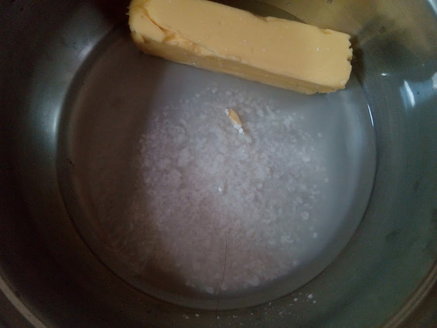 En un cazo ponemos a fuego medio el agua, azúcar glas, sal y mantequilla.