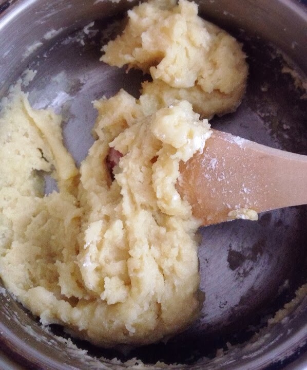 4. Dejar enfriar y agregar los huevos batidos lentamente hasta obtener una masa lisa y brillante. (este paso se puede hacer a mano o en la batidora). La consistencia de la masa debe ser cremosa mas no liquida. Para comprobar que esta en el punto, al coger un poco de masa con una cuchara y dejar caer el exceso, esta debe formar un triangulo invertido.