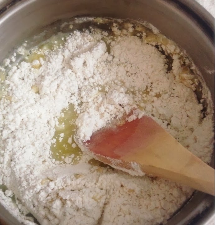 2. Retirar del fuego y añadir la harina de golpe y revolver.
