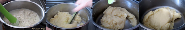 Cuando empiece a hervir retirar del fuego, añadir la harina tamizada y con la ayuda de una espátula ir removiendo la mezcla hasta que la masa se separe de las paredes de la cazuela. Volver a colocarla al fuego 30 segundos para que reseque ligeramente, retirar.