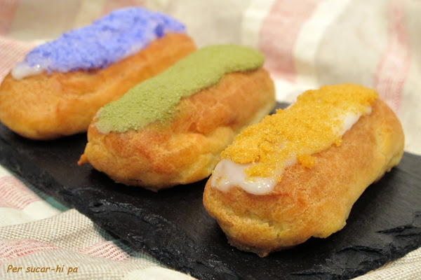 Untar la parte superior del eclair con el fondant, y "mojar" esta parte en el azúcar de color, de manera que se adhiera en la superficie. Hacer la misma cantidad de cada color y reservar.