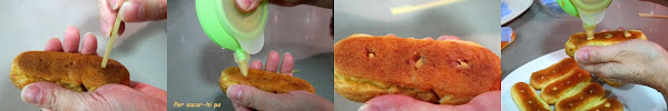 Engrasar con un poco de mantequilla una bandeja de horno y formar con la masa los eclairs. Cocer a 180º durante 20 minutos, calor arriba y abajo. Dejar la puerta del horno ligeramente abierta, por ejemplo con un trapo colgando para que no cierre del todo, para facilitar que salga el vapor que se genera en cocción.