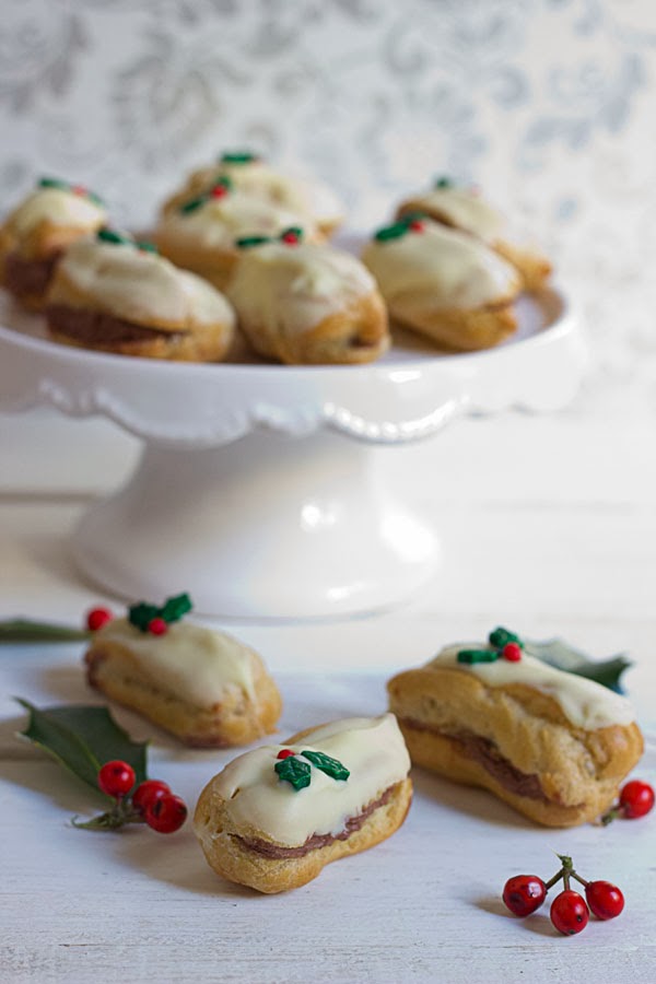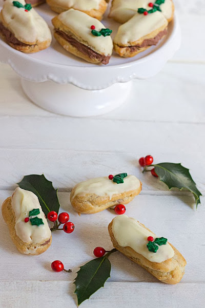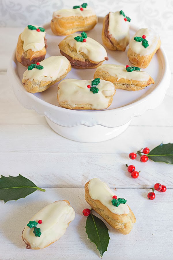 Como me habían sobrado estas hojitas de muérdago de azúcar de una galletas que había decorado, he pensado que sería una buena idea decorar estos eclairs con ellas, y la verdad es que han quedado muy graciosos y vistosos.