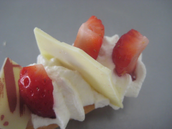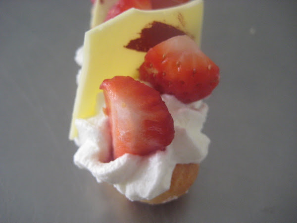 Preparación:Calentar la leche con el agua, la sal, la corteza de limón, la mantequilla y el azúcar. Cuando rompa el hervor retirar la corteza de limón y añadir de golpe la harina; mantener a fuego muy suave y trabajar unos minutos hasta que la mezcla esté fina y se desprenda de las paredes del cazo. En este punto retirar del fuego y agregar los huevos de uno en uno, de manera que hasta que no esté bien incorporado uno no se agrega el siguiente. Luego llenar con la masa una manga pastelera con boquilla lisa gruesa y escudillar los éclairs de unos 12-15 cm. Cocer en el horno a 180º-190º C, hasta que estén dorados e inflados, tardan al menos unos 20 minutos. Si se hacen en tapete de silicona, como los macarons quedan más perfectos y todos iguales. Es preciso dejarlos, una vez cocidos, unos 15 minutos con la puerta del horno abierta. Así se secan y no se bajan. Luego dejar enfriar sobre rejilla. En este caso yo los he abierto quitándoles una tapita a todo lo largo, pero que no llegue a la mitad, así quedan como una barquita donde colocar el rico relleno. Así preparados, reservar. Montar la nata (crema de leche) que deberá estar bien fría y cuando esté. a medio montar, añadir el azúcar glas. Terminar de montar, teniendo mucho cuidado para que no se corte y una vez montada poner en manga pastelera con boquilla rizada gruesa. Cortar las fresas bien limpias y secas como se prefiera, Incluso dejar algunas enteras si son pequeñas. Una vez todo preparado ir montando los eclairs con la nata (crema de leche), las fresas y láminas de chocolate blanco. Un detalle en verde queda muy bien, pero yo había gastado mis hojas de menta en otros de frutos rojos que un día pondré por aquí,. De momento disfrutad con estos.