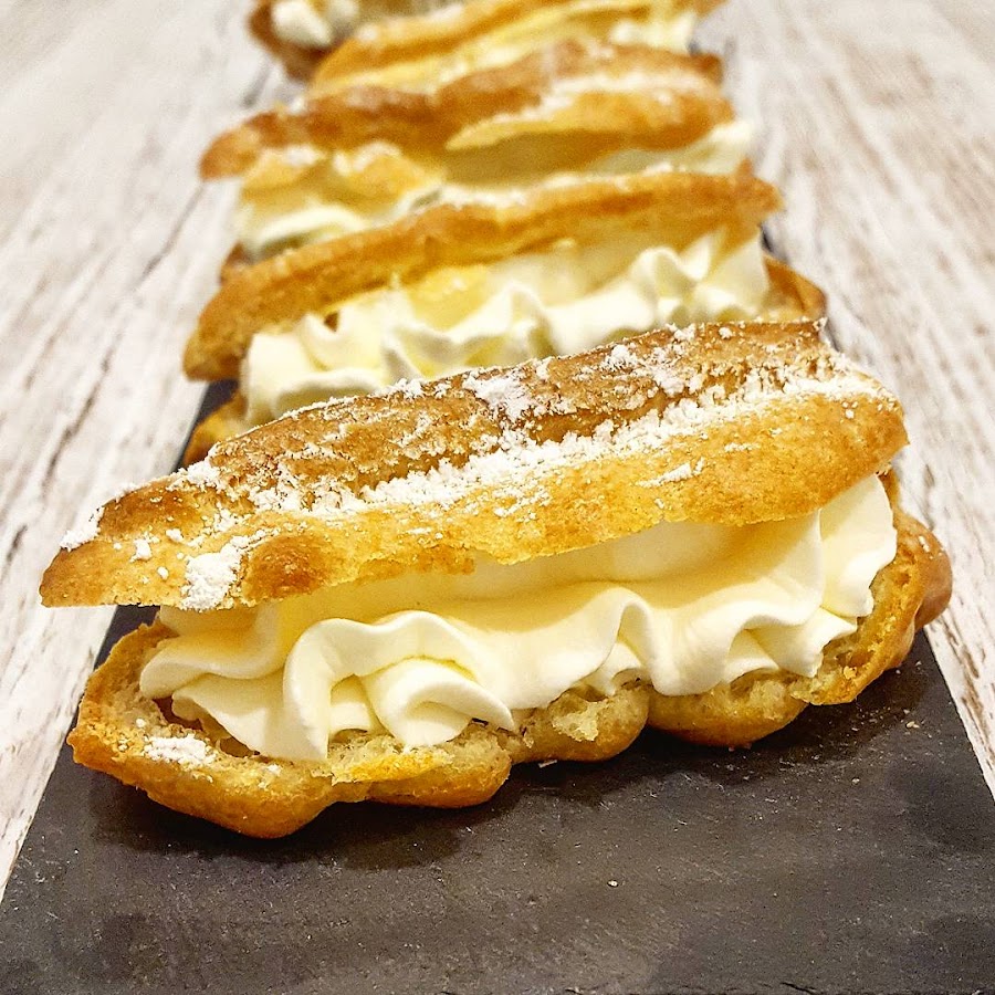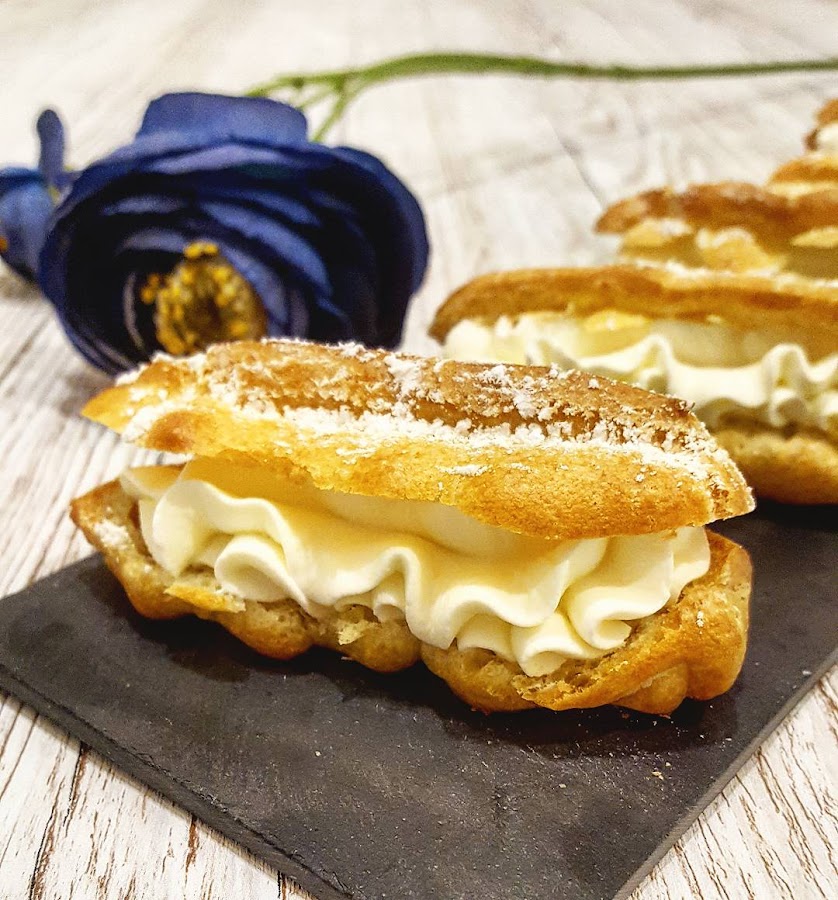 Son eclairs. En este caso, rellenos de nata (crema de leche).