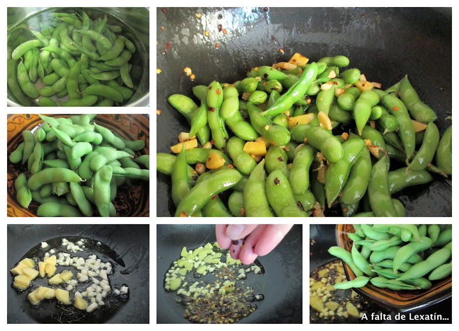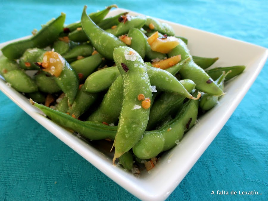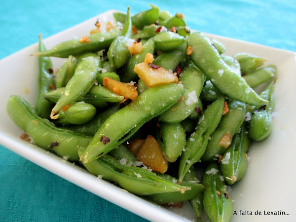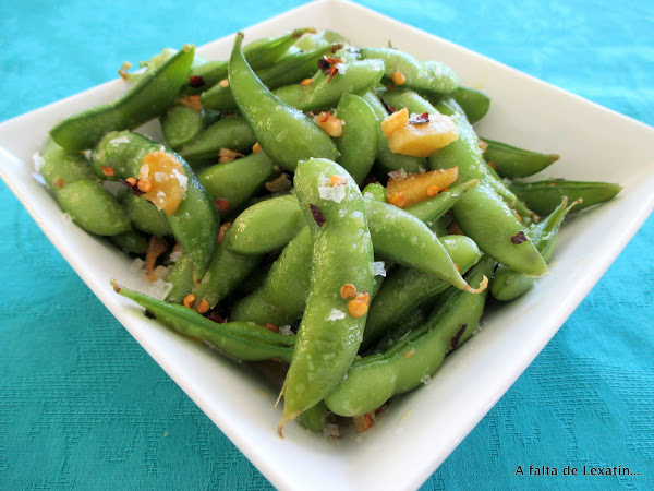 Te las ponen como aperitivo en los restaurantes asiáticos y se comen y envician tanto como las pipas, desde que las descubrí en la sección de congelados las preparo muy a menudo porque me encantan, lo normal es comerlas solo cocidas y con sal pero así, picantes nos gustan todavía más