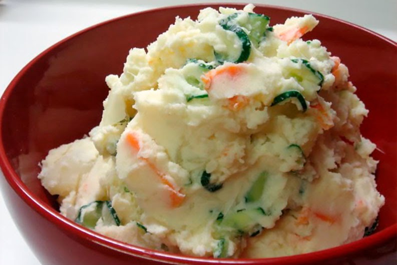 2. Tritura las patatas en un tazón grande. Condimenta la patata con la sal y el vinagre.