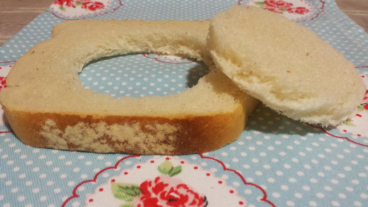1. Cortamos un círculo en el centro de la rebanada de pan de molde con ayuda de un cortapastas. Si no disponemos de él, podemos usar un vaso.