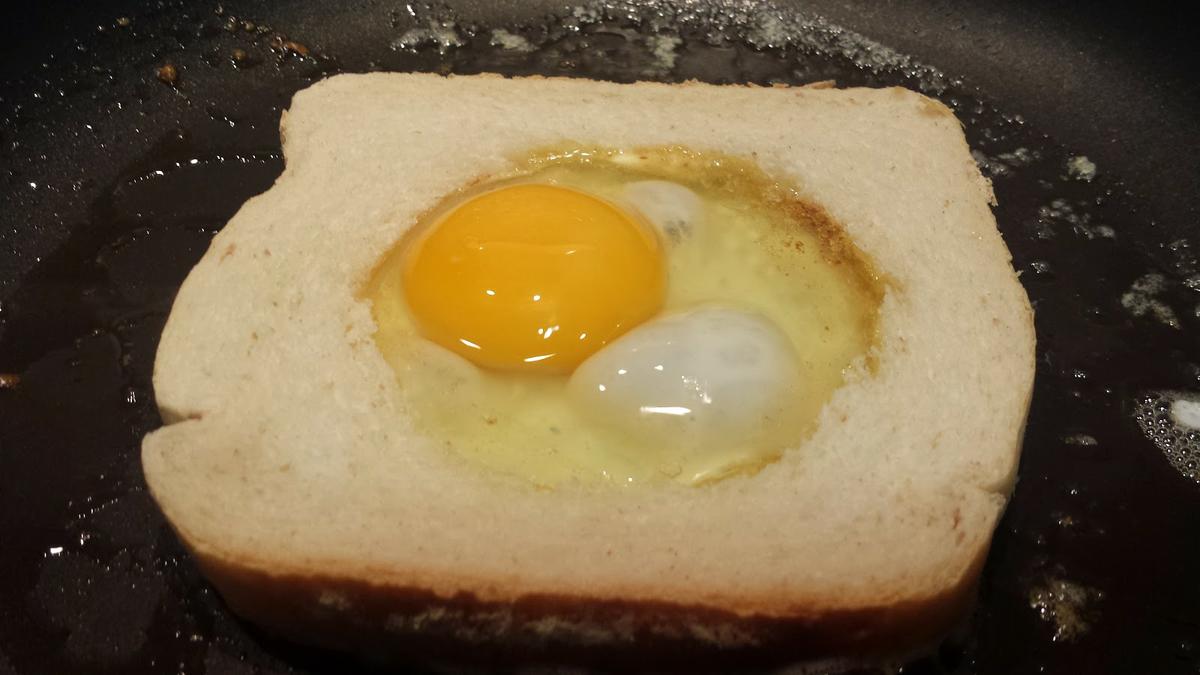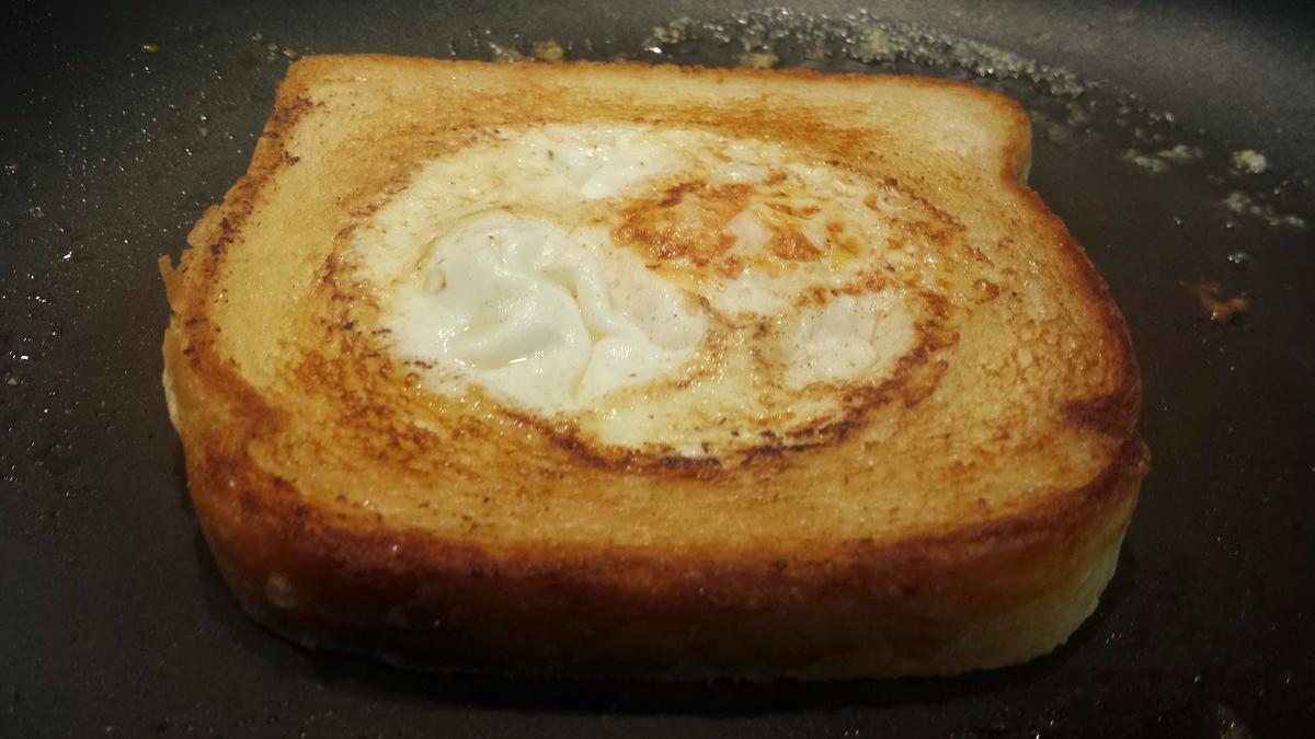 2. Añadimos mantequilla a la sartén y cuando esté caliente, añadimos el pan, dejamos que se cocine un minuto aproximadamente y echamos mantequilla también en el agujero. Cuando se funda añadimos el huevo y dejamos que se cuaje bien por la parte de abajo.