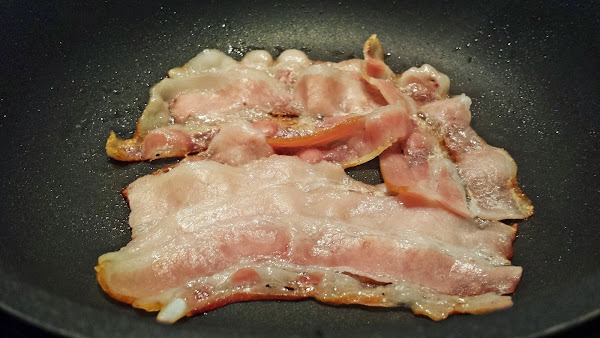 En una sartén aparte bien caliente y sin aceite, ponemos el bacon que se irá cocinando con su propia grasa. Cuando ya esté tostado, apartamos del fuego y reservamos.