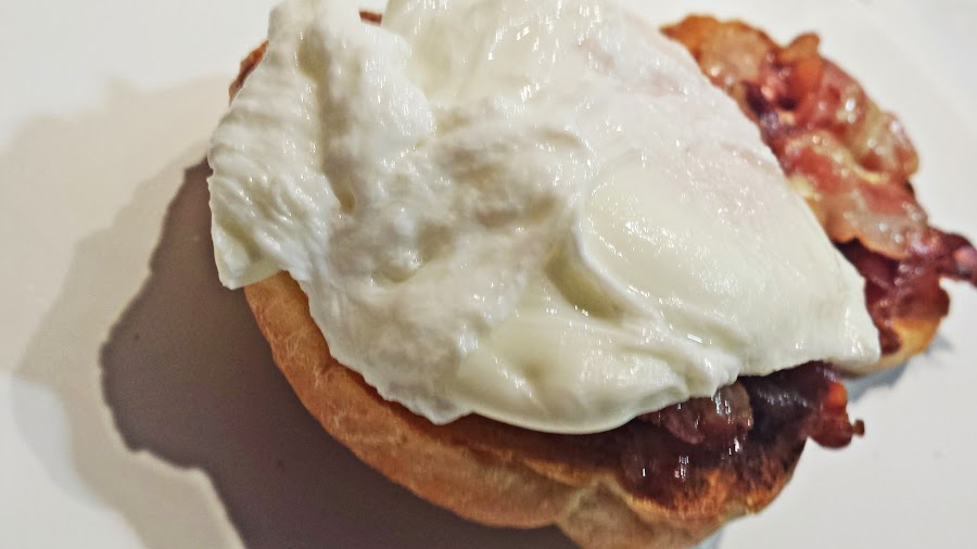 Montamos poniendo las dos mitades de cada panecillo boca arriba en el plato. Añadimos una cucharada de salsa holandesa sobre el pan, encima ponemos el bacon y sobre éste los huevos bien escurridos para evitar que el pan quede demasiado húmedo, salpimentamos los huevos y terminamos con una buena cucharada de salsa holandesa.