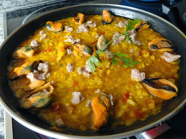 Esta receta tiene una pequeña historia... Hace unos años, en una de las escapadas que nos damos con un grupo de compañeros de mi marido, con sus esposas y algunos de los hijos, se nos antojó hacer una paella, y el encargado de hacerla siempre cuando vamos al campo o a alguna casa rural es el amigo Ramón, y en esta ocasión también fue el encargado de prepararlo. Pero el problema es que era festivo y en el supermercado del pueblo en el que estábamos no encontramos ni carne, ni marisco, ni nada con qué preparar la paella, sólo teníamos para hacer el sofrito, así que a Ramón se le ocurrió prepararlo con atún de lata. Y salió un plato riquísimo que después nosotros hemos repetido ya varias veces en casa. Se trata de preparar un buen sofrito, y en los cuatro o cinco últimos minutos de la cocción del arroz echamos el atún.