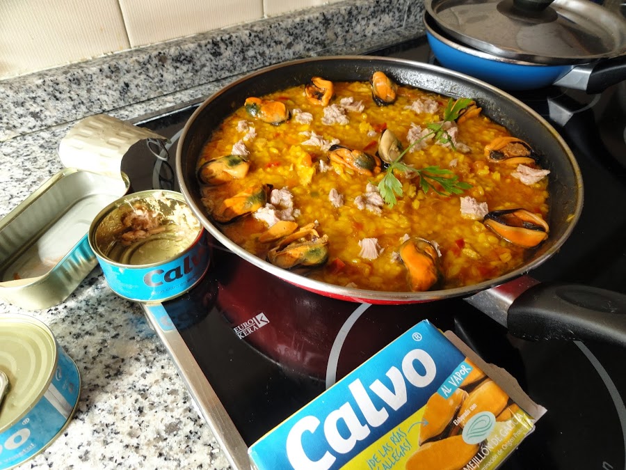 He ido pochando toda la verdura, cuando estaba hecha, he agregado 1 vaso de arroz, lo rehogo bien, y echamos el caldo o agua con pastilla de caldo, el colorante y la sal (cuidado que el atún también aporta sal) y cuatro o cinco minutos antes de apagar le agregamos el atún. Dejamos reposar tapado. Para esta receta he utilizado atún en aceite de girasol CALVO y en el último momento he colocado por encima unos mejillones al natural también de CALVO. Esta Empresa ha tenido la amabilidad de enviarme una caja con algunos de sus productos. Desde esta entrada la doy las gracias por el envío.