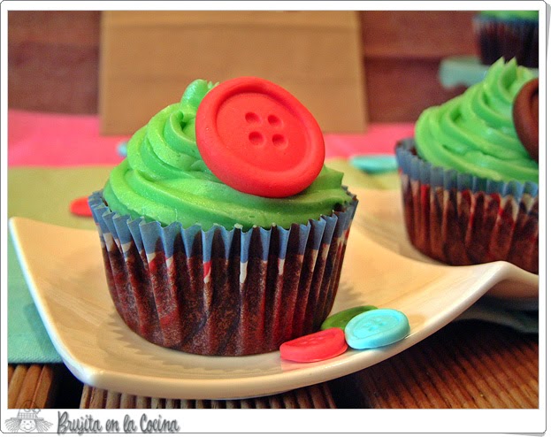 El sabor estaba claro tenía que ser de chocolate (soy chocoadicta y además es un sabor que siempre triunfa) y el relleno... pues mas chocolate en este caso blanco, y a los cupcakes (hechos igual que la tarta pero en tamaño individual) les puse unas gotas de menta y colorante para darle otro toque sin perder la esencia y la idea, los botones son de fondant.