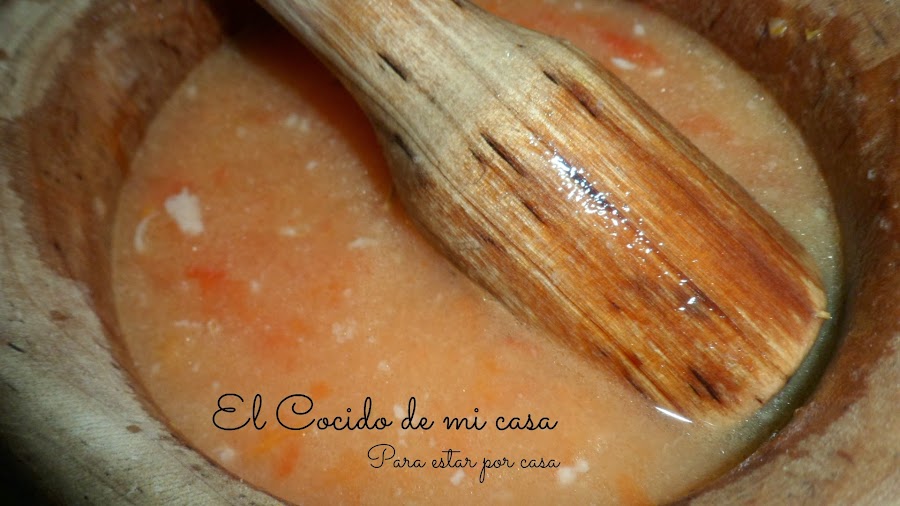 En mi casa es tradicional preparar Salsa de Tomate y cominos con la que aliñar los garbanzos. Su preparación es fácil. Si vamos a preparar la salsa, añadiremos a la cocción de la sopa un tomate para que se ablande un poco y después lo retiraremos entero. Quitaremos la piel al tomate. En un mortero machacaremos ajo, cominos, pimiento verde, el tomate pelado, y un poco de caldo del cocido.