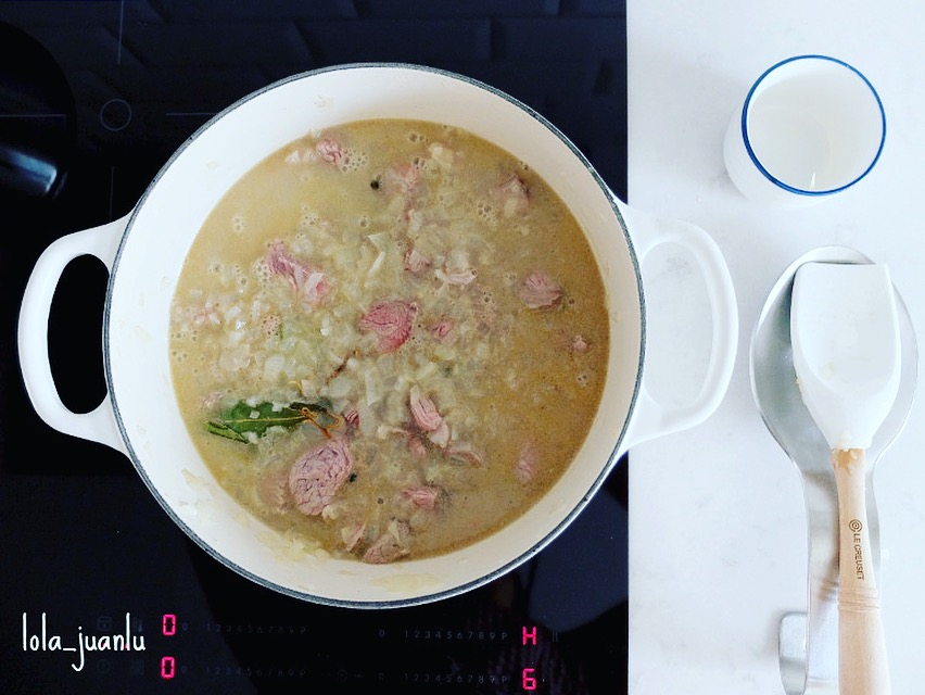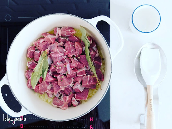 Añadimos la carne, el laurel y los granos de pimienta. Removemos hasta que la carne cambie de color y vertemos el caldo hirviendo. El caldo debe cubrir la carne y la cebolla. Agregamos un poco de sal, tapamos y dejamos cocer a fuego lento durante 45 minutos.