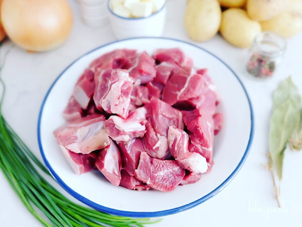 Cortamos la carne en trozos de tamaño regular, como de un bocado. Podemos pedirle a nuestro carnicero que nos lo prepare y así ahorramos tiempo.