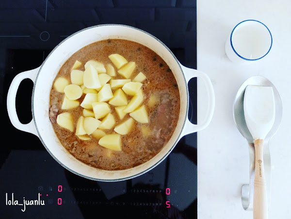Transcurridos 20 minutos, removemos y agregamos el resto de las patatas. Si vemos que necesita más caldo, podemos añadir un poco. Cocemos a fuego lento durante otros 20 minutos, sin olvidarnos de remover de vez en cuando para que nuestro guiso no se pegue.