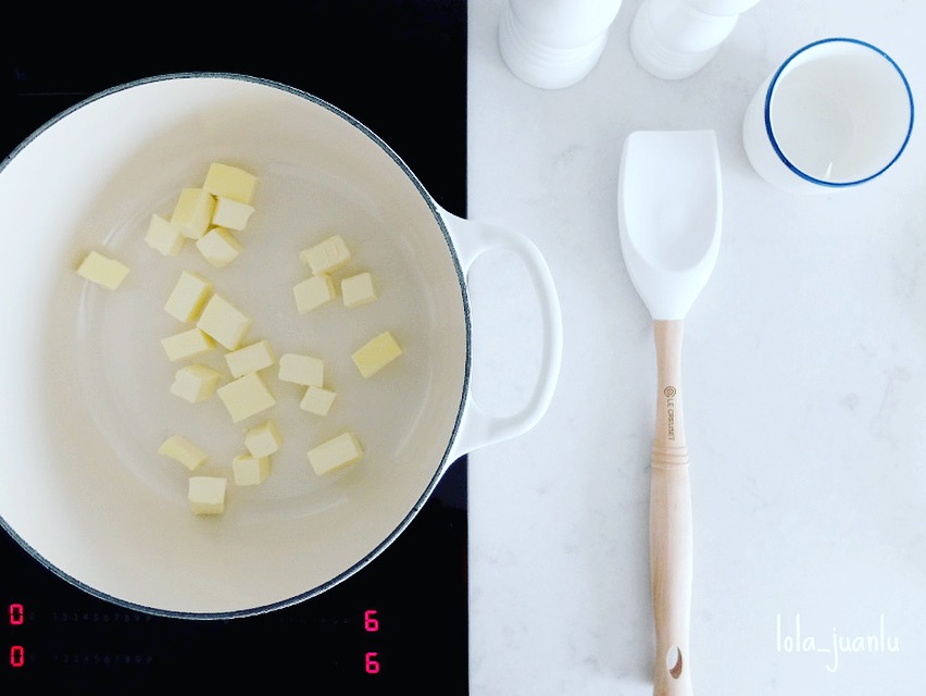 Por otro lado, ponemos una olla al fuego e introducimos la mantequilla. Cuando se haya derretido, agregamos la cebolla y cocinamos hasta que quede translúcida.