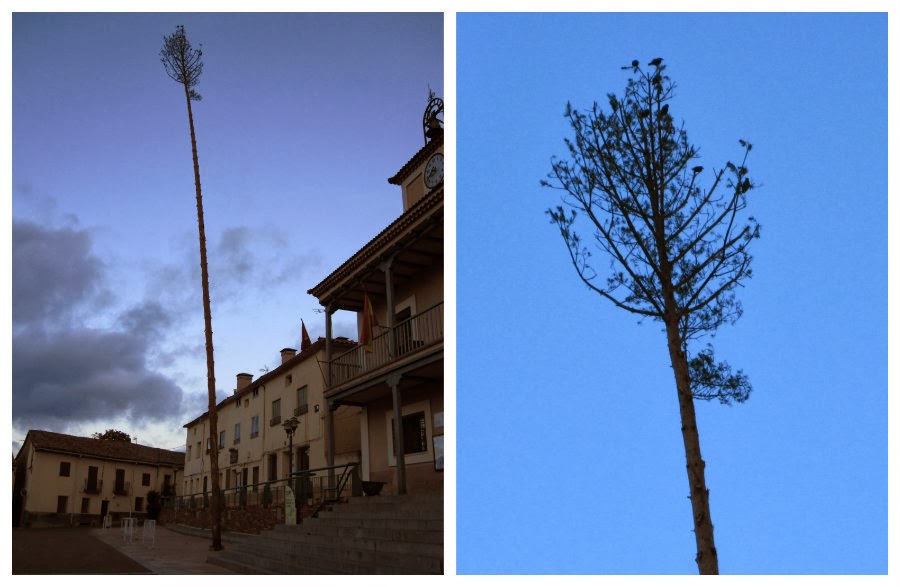 Todo cerrado, salvo la panadería NANI que está en la plaza de la Iglesia y de la que hablaré más adelante (no os lo perdáis). Y justo en frente de la panadería, como una bengala que sube al cielo, hay un árbol tan alto que si no roza la luna es de milagro y todo pelado. Sólo tiene una escueta copa que a esas horas estaba plagada de mirlos.