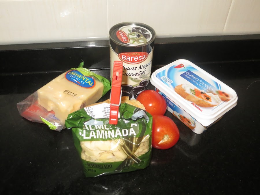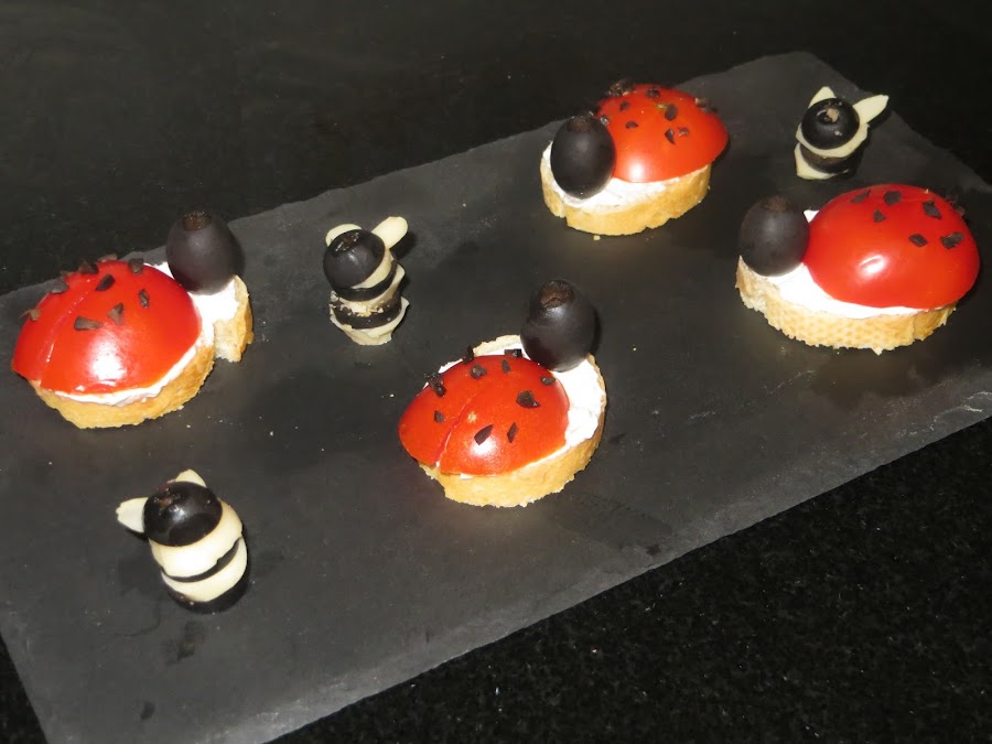 Picar las aceitunas lo más pequeñas posibles. Cortar los tomates en dos y poner el picadito de aceitunas sobre ellos. Untar el queso sobre las rebanadas de pan y poner los tomates sobre ellos. Poner una aceitunas sobre la galleta imitando la cabeza de la mariquita (hay que poner el agujero de la aceitunas hacia arriba).