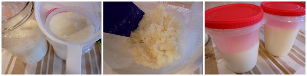 Con la leche ya espesa necesitas el colador de plástico. En un recipiente cuela la leche y escurre bien los gránulos en el colador. Limpia el frasco de cristal y vuelve a repetir el proceso añadiendo leche a los gránulos para volver a obtener leche kefirada para el día siguiente.