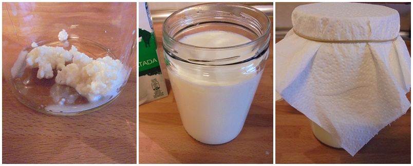 Cuidar los gránulos es sencillísimo. En el frasco de cristal colocamos los gránulos y añadimos un litro de leche (yo le pongo semidesnadata). Tapamos el frasco con una tela fina, tipo gasa o sencillamente con papel de cocina como yo. Esto es porque el kéfir debe respirar pero evitamos que le entre polvo. Con una goma ajustamos el papel y dejamos el frasco a temperatura ambiente, por ejemplo dentro de un armario.