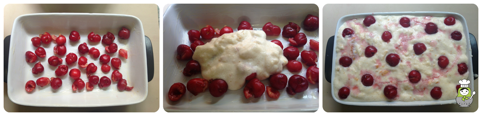 Untamos con mantequilla un molde de cristal o cerámica apto para horno. Colocamos la mitad de las cerezas en el fondo y vertemos encima la masa. Colocamos las cerezas restantes en la parte superior y esparcimos la almendra laminada.