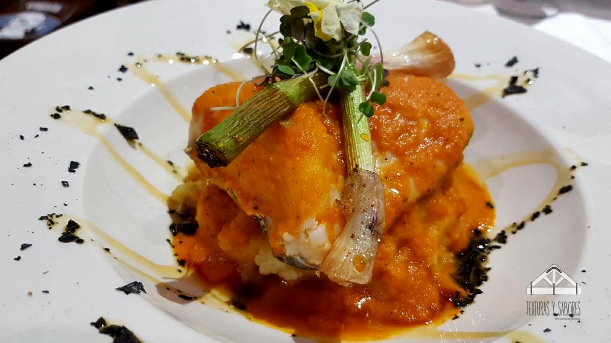 Risotto en tres cocciones con carabineros y setas. Y por último os dejo un platazo, un lomo de bacalao a la vizcaina con una emulsión de pil pil. El lomo de bacalao está cocinada a baja temperatura, tanto su sabor y cocción en su punto, napado con la emulsión de pil pil. Debajo lleva una base de patatas.