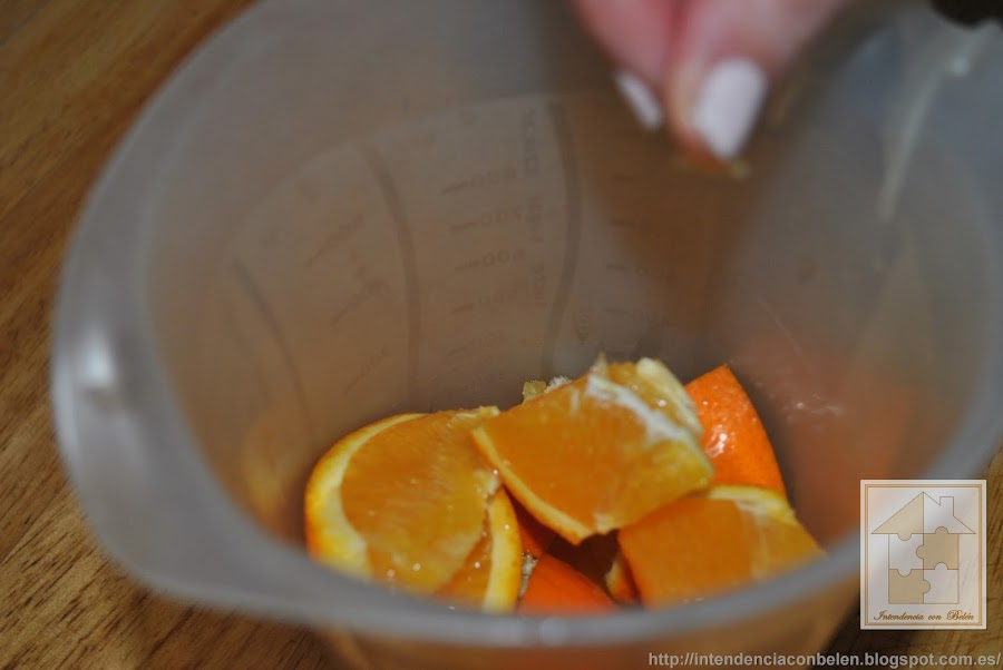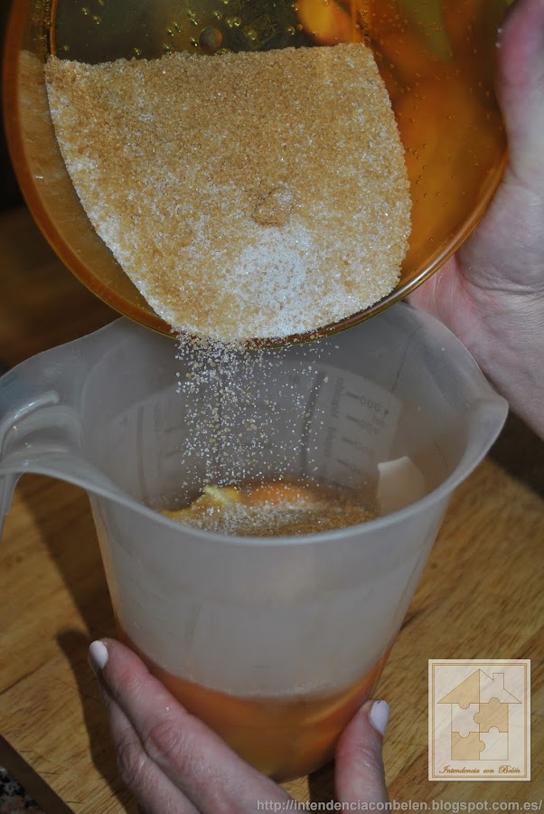 La troceamos y añadimos al recipiente donde batiremos con el resto de ingredientes. Os aconsejo que sea tipo jarra, ya que será la aportación liquida de nuestro bizcocho, y necesitamos aprovechar cada gota.