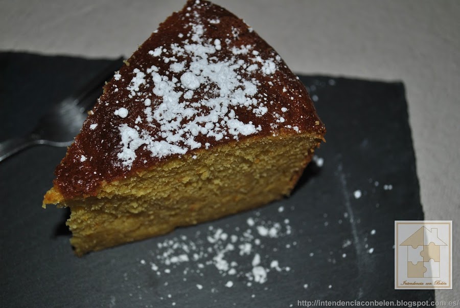 Sólo queda decidir si queremos comerlo así o decorarlo para la ocasión. Podéis hacer un almíbar de naranja y bañar el bizcocho y decorar con unos gajos de naranja caramelizada o espolvorear con azúcar impalpable como he hecho yo hoy.