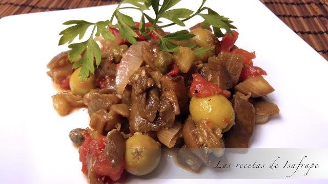 Otro plato delicioso y fresco que podemos preparar con berenjenas es esta Caponata siciliana que nos trae Las recetas de Isafrape. En una sartén con un poco de aceite rehogamos cebolla y apio. Luego se va agregando berenjena, ajo, tomate, vinagre y azúcar, y se mezcla todo muy bien. Finalmente se añaden aceitunas y alcaparras, y podemos espolvorear perejil picado al momento de servir. Tienes todos los detalles de esta receta en su blog.