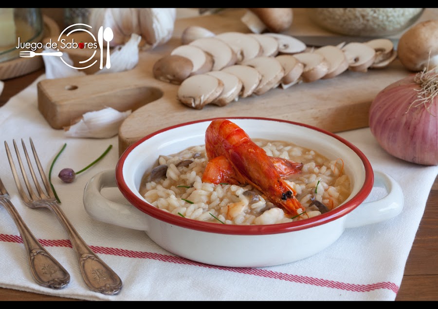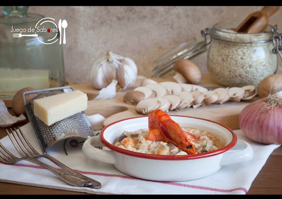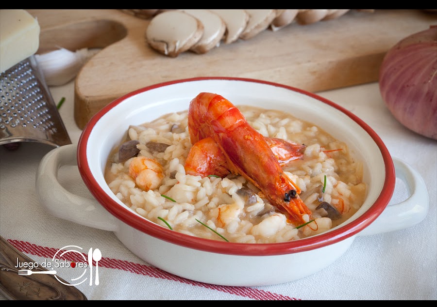 Cuando hicimos el Risotto de setas con confit de pato decíamos en la presentación que “el risotto es muy agradecido y permite hacer infinidad de combinaciones”. Cierto. Sobre la base de un buen arroz (los mejores son los de la variedad carnaroli y arborio, de grano redondo y con mucho almidón) hemos sumado unas gambas y unos champiñones portobello y el resultado ha sido un excelente plato con un intenso sabor a marisco y un ligero contrapunto a montaña que le da la seta.