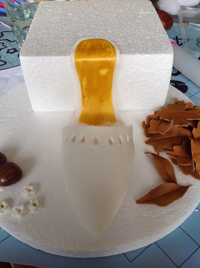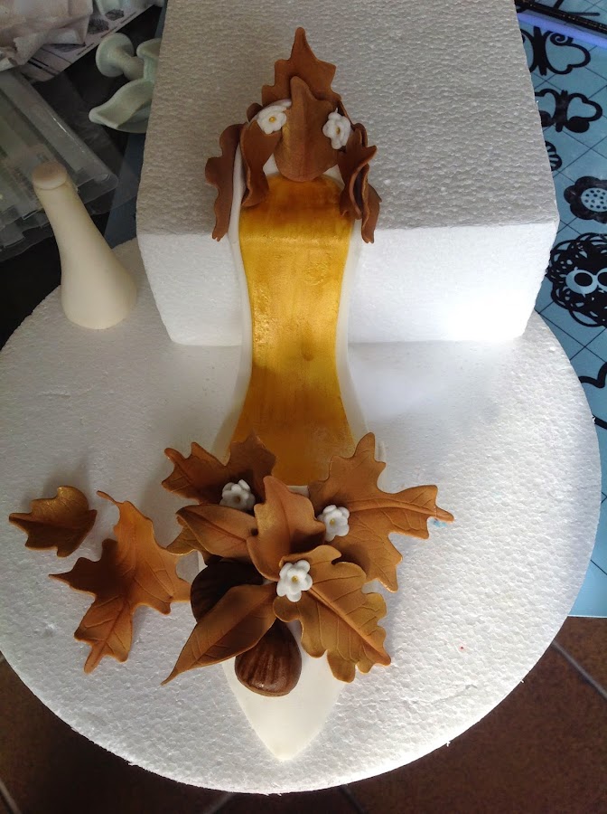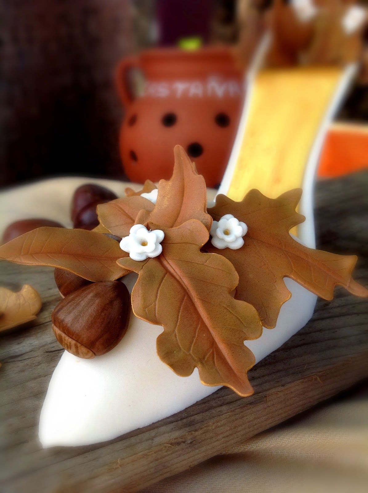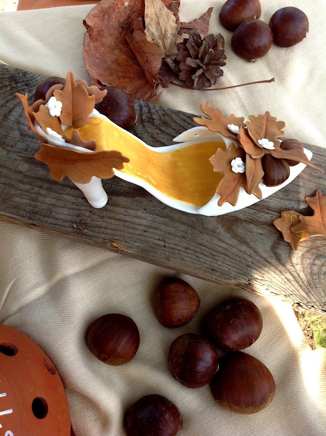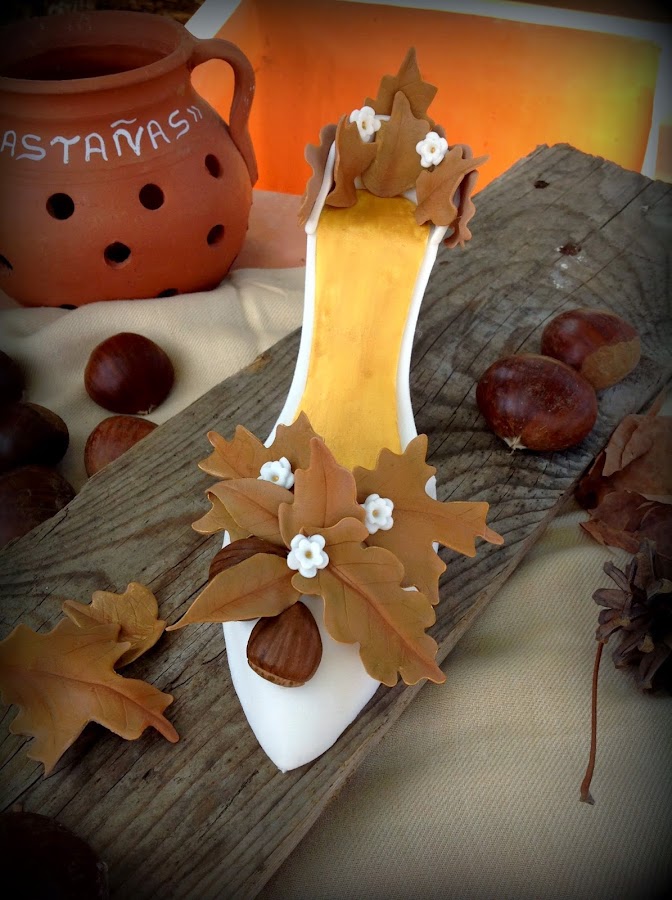 El zapato lo elegí en blanco, porque los ojos también tienen blanco, ¿no? Y luego le hice las hojas marrones, las castañas marrones y unas cuantas florecillas blancas que alegraban el conjunto. El dorado tenía que ponérselo porque creo que le añadía un toque más sofisticado y elegante, como a mí me parece el otoño, no alocado y vibrante como la primavera.