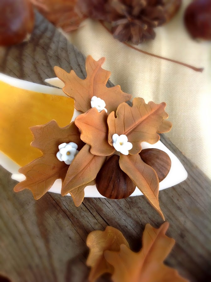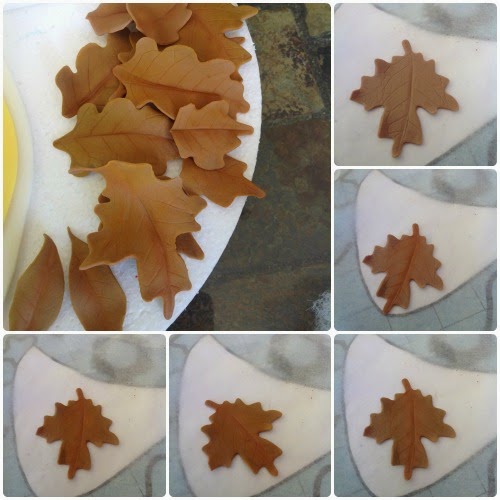 Para hacer las hojas utilizaremos también la pasta de goma que teñiremos con un poco de colorante marrón. Estiraremos la masa y con los cortadores de hojas, haremos unas 15 hojas de diferentes formas.