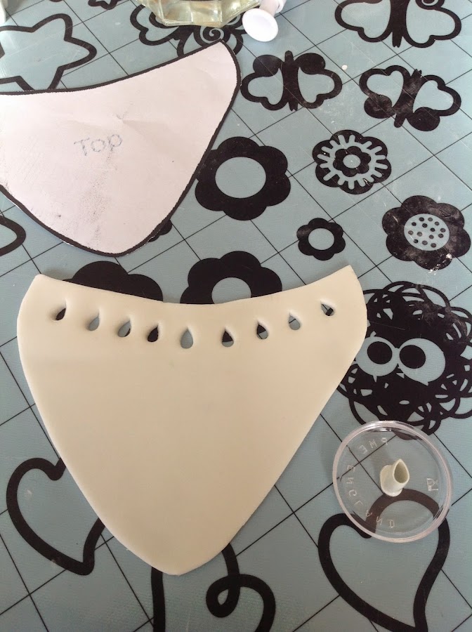 Amasamos el fondant amarillo, lo estiramos y lo cortamos con la plantilla interior del zapato (la que no tiene punta).