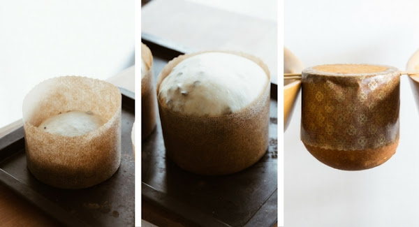 Colocar cada porción de masa en un molde de papel especial para panettone de tamaño mediano (lo venden en tiendas de repostería). Colocar los moldes sobre una bandeja de horno y tapar holgadamente con un paño de cocinaHORNEADO: