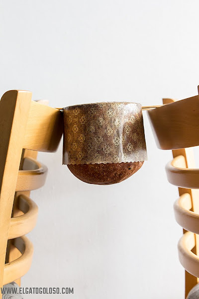 Una vez fuera del horno los panettones deben enfriarse boca abajo para que su copete no colapse, para ello insertar dos brochetas de madera en la base de cada panettone y suspenderlos en algún lugar donde puedan colgarse (yo los coloqué entre dos sillas). Dejar enfriar por completo (al menos dos horas).