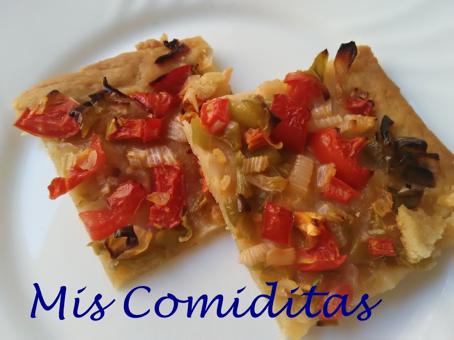 Pues en Mallorca pueden presumir de sus cocas, elaboradas con una riquísima masa sobre la que podemos poner un sin fin de ingredientes. Hoy os traigo una de las más sencillas, con unas simples verduras.Creo que he visto por ahí que a esta coca en concreto la llaman "Coca de trampó"