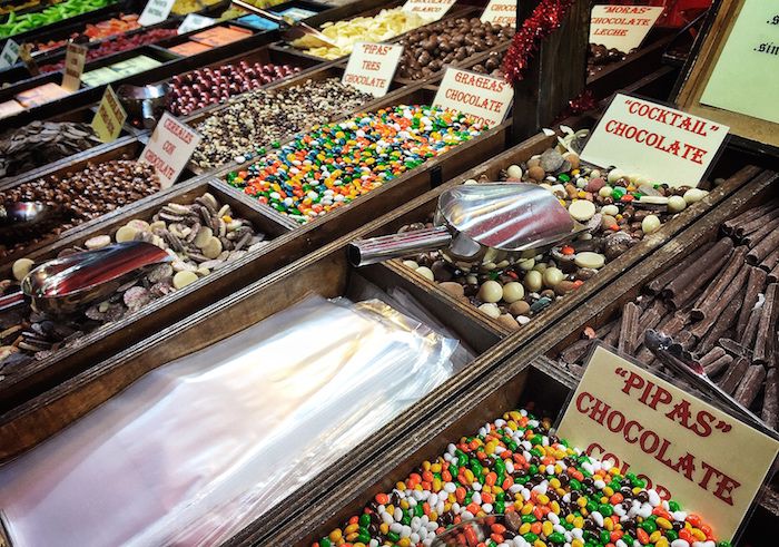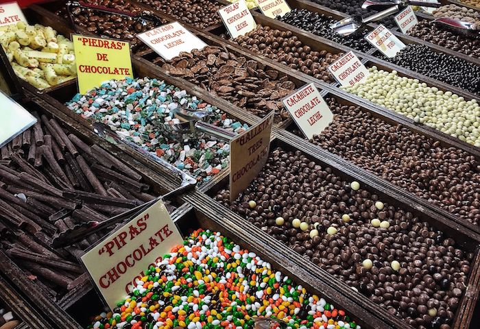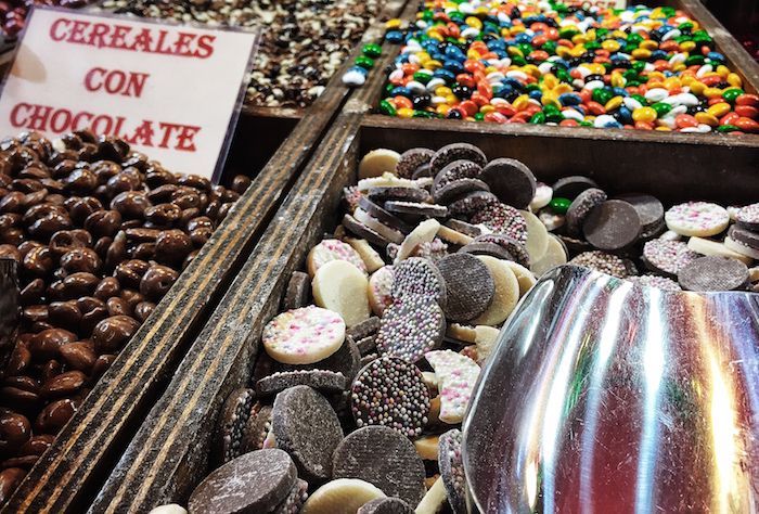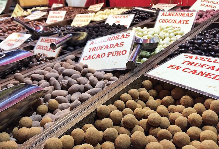 El caso es que "Paquito" (no hemos podido evitarlo), invita a los viandantes domingueros que pasan frente a su puesto, a probar un género que al principio llama la atención sólo un poquito: toda clase de frutos secos recubiertos por diferentes tipos de chocolate fundido, o rebozados en cacao y especias, incluso gominolas elaboradas con fruta natural. Todo lo que pueda bañarse en chocolate, ahí aparece expuesto. No podemos dejar de acordarnos del episodio de «Los Simpsons» en el que los niños visitan una fábrica de chocolate y se asoman a la cuba dejando caer todo tipo de objetos. Igual pero en rico.