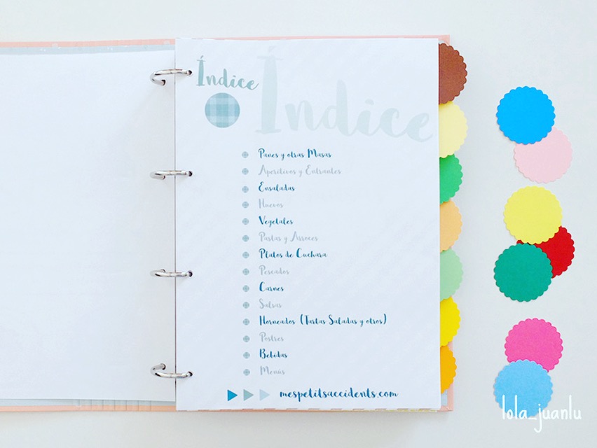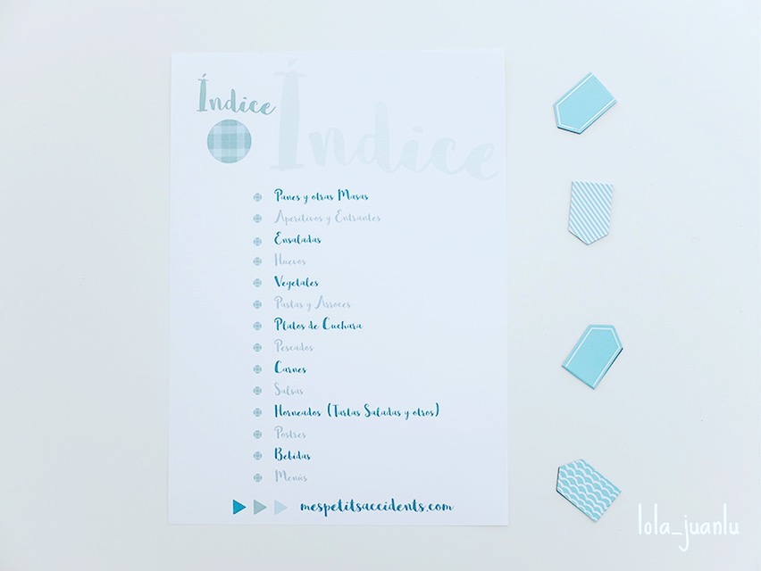 Después, hacemos los separadores de las diferentes secciones del recetario. Pero para ello, tenemos que tener claro el índice. Hemos tenido en cuenta varias cosas, por ejemplo, el diseño de la plantilla y del blog, el tipo de letra, los colores utilizados, las recetas que hemos elaborado y que vamos a hacer o tenemos en mente.