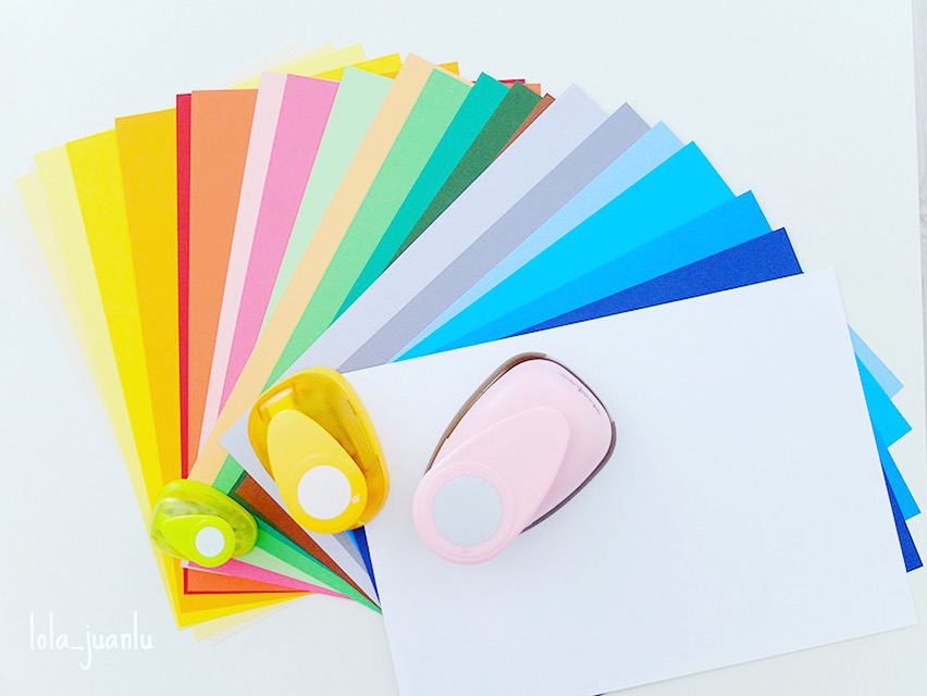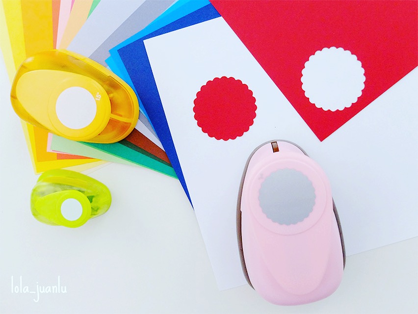 Por último, nos ponemos con los marcadores. Para ello hemos utilizado papel grueso de colores y una troqueladora. Los colores de los marcadores tienen que ir acorde con los colores de los diseños de los separadores. La troqueladora que hemos elegido hace los marcadores en forma de galleta.