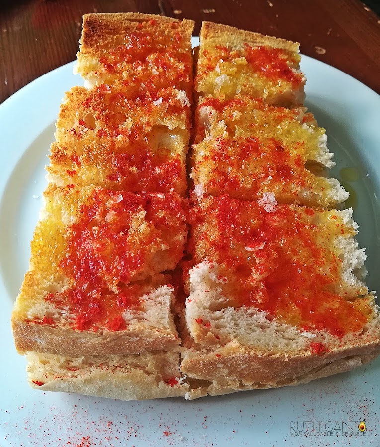 2º El pan es cortesía de la casa, una delicia para los murcianos, pan del güeno con pimentón, aove y sal en escamas.