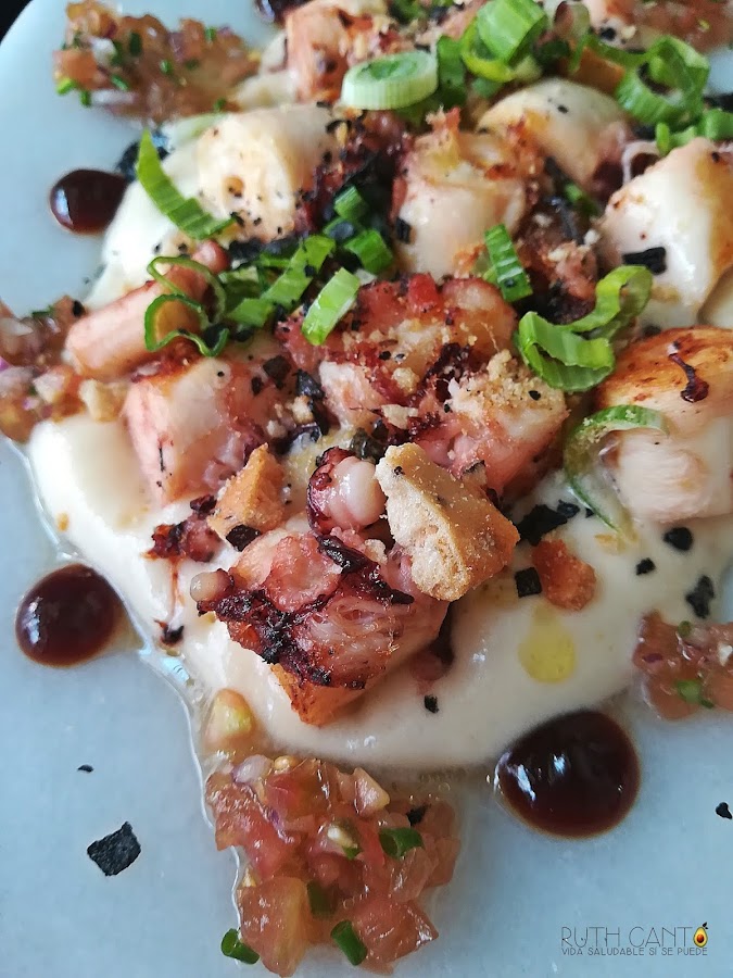3º Pata de pulpo, con puré de patata y encurtidos de verduras, la pata esta cocida y planchada con salsa hoisin, un mar de matices para los sentidos.