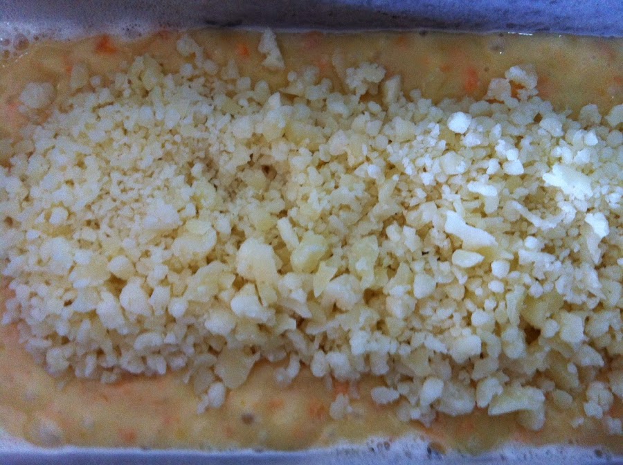 Engrasaremos un molde alargado (el nuestro es de 24x11 y estas cantidades quedan perfectas), donde pondremos la mitad de la mezcla, añadiremos el queso que reservamos en el centro, teniendo cuidado de no llegar a los bordes y el resto de la mezcla. Si habéis mezclado todo el queso y las nueces es tan fácil como ponerlo en el molde de una vez.
