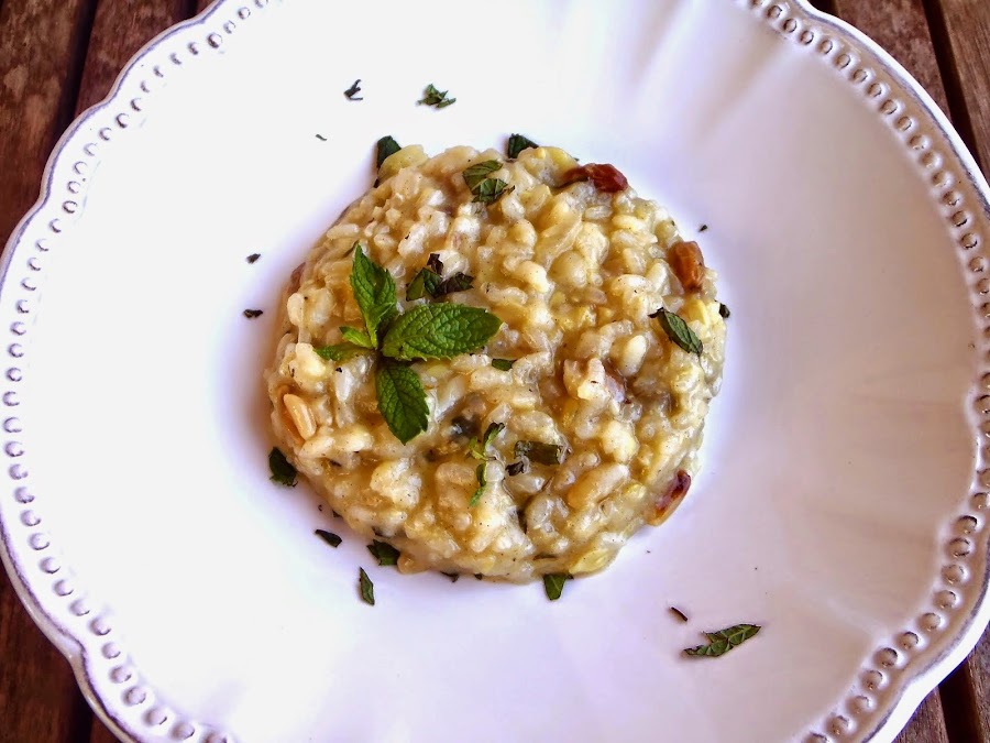 Desde el blog "Les receptes que m?agraden" nos llega este risotto a la menta con pasas y piñones, otra receta que dará un toque de frescura a vuestros platos veraniegos. ¿Todavía no conocíais la receta? ¿A qué esperáis para prepararla?