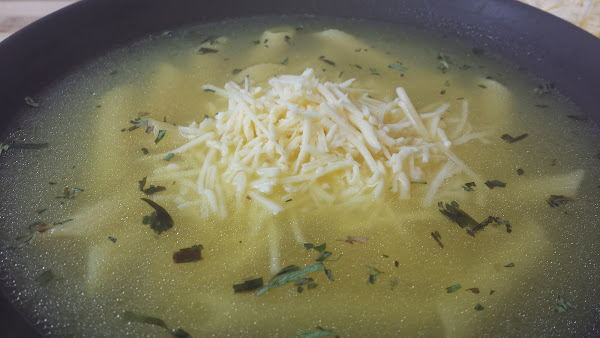 Sopa de penne rigate con azafran y estragón acompañado de queso emmental rallado.