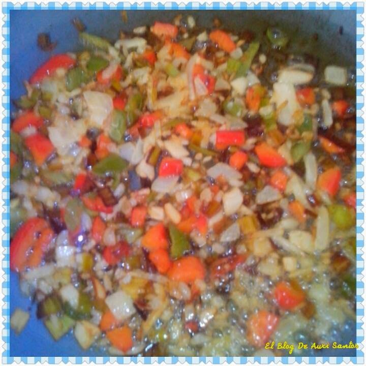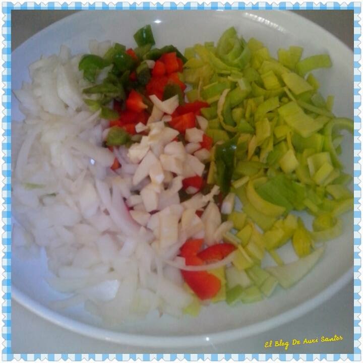 1 puerro,1 pimiento verde y 1 rojo,1 cebolla y 2 dientes de ajo,aceite de oliva y sal