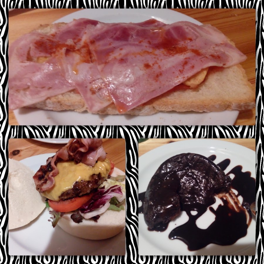 Bien en la siguiente foto podéis ver los primeros y el postre...La verdad que ya con los entrantes te quedas bastante bien porque ponen una cantidad bien.En la primera foto podéis ver una zapatilla de lacon,pimentón y patata , muy buena y además suficiente cantidad para quedarte bien. Si sois de mas comer comer podéis pediros una hamburguesa como la de la foto, una clásica que llevaba la hamburguesa,lechuga,bacon,queso y tomate. Es una hamburguesa completa y la verdad que te quedas bastante bien. Para postre ( que lo pedimos para compartir....estábamos muuuuyyyy llenos....) pedimos un couland de chocolate.....chocolaaaateeeee... es inevitable pedírselo aunque estés a punto de reventar jajaja.