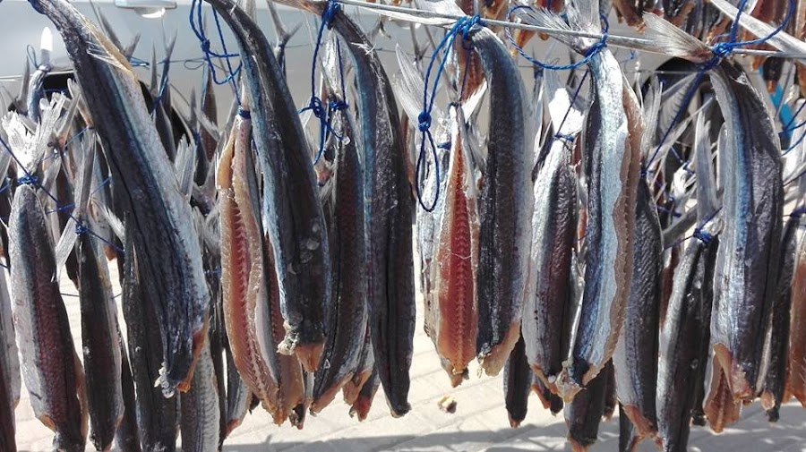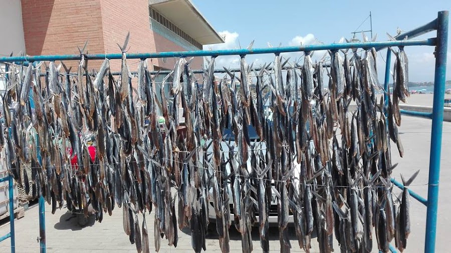 Los pescadores salen a su captura y , después son limpiados y desangrados poniéndose al sol, para que se sequen. Se come así seco como cualquier salazón.